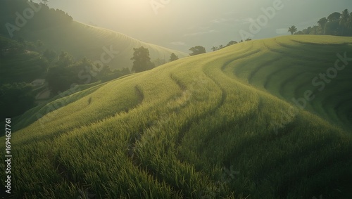 Terraced Rice Fields at Sunrise – Aerial Agricultural Landscape