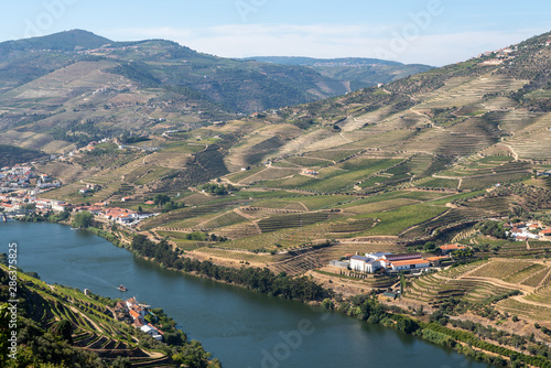 Terraces of grape vines for port wine production line the hillsides of the Douro valley in Portugal