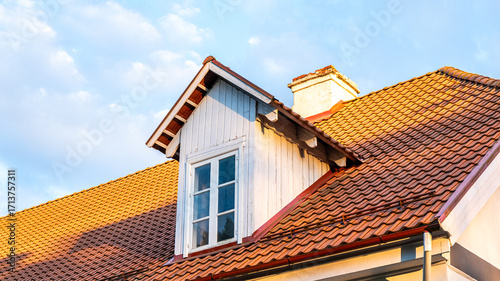 Terracotta roofing tiles on a traditional house, showcasing energy-efficient design, durable construction, and beautiful aesthetics under a clear blue sky with copy space