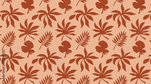 tropical, leaf, pattern, seamless, background, terracotta, botanical, nature, plant, foliage, organic, illustration, design, textile, wallpaper, print, exotic, jungle, palm, fern, monstera, stylised, minimalist, vector, graphic, art, decorative, warm colors, earth-tone, ocher, peach, muted, retro, vintage, abstract, modern