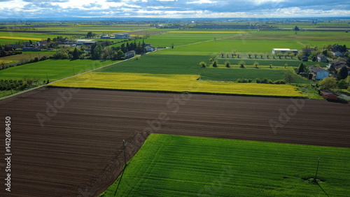 Terre e colori della Pianura Padana con colza gialla, campi seminati, verde, alberi, cielo, piccolo borgo, San Giuliano Vecchio, Alessandria, Piemonte, Italia