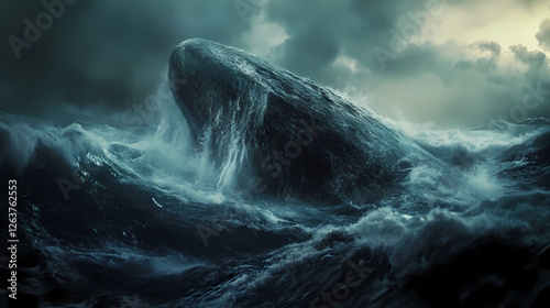 Terrifying sea leviathan rising from turbulent ocean depths for horror movie posters and thrilling book cover artwork. Stormborn Leviathans. Illustration