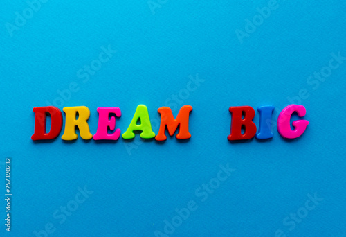 text dream big from plastic colored letters on blue paper background