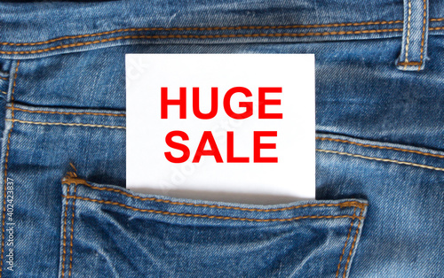 Text Huge Sale on white paper in the pocket of blue denim jeans
