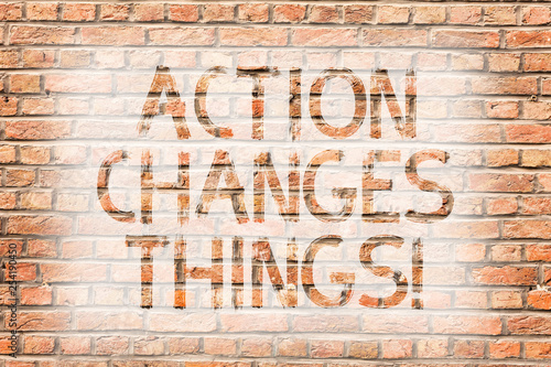 Text sign showing Action Changes Things. Business photo text improve yourself Do not stand still Let s is do it Brick Wall art like Graffiti motivational call written on the wall