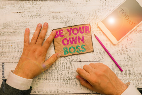 Text sign showing Be Your Own Boss. Business photo text Entrepreneurship Start business Independence Selfemployed Hand hold note paper near writing equipment and modern smartphone device