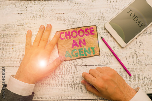 Text sign showing Choose An Agent. Business photo text Choose someone who chooses decisions on behalf of you Hand hold note paper near writing equipment and modern smartphone device