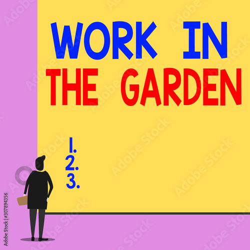 Text sign showing Work In The Garden. Business photo showcasing Tending the Lawn Yard Plant Seedlings and Crops Back view young woman watching blank big rectangle. Geometrical background