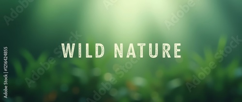 Text Wild Nature on green blurred background with light and plant silhouettes. Abstract banner with copy space for design and print