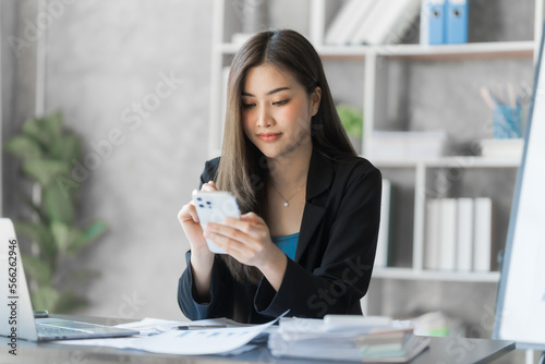 Texting message on mobile, Beautiful Asian female bookkeeper doing online accounting with laptop in private accounting office, balance sheet and stock market statistics.