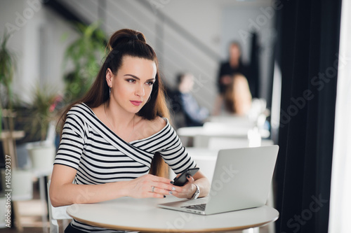 Texting woman sitting at the table and holding the mobile phone, thinking. Adult female sitting with a laptop and looking away.