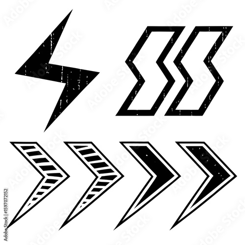 arrow, lightning bolt, directional, symbol, graphic, design, black, white, textured, grunge, vintage, abstract, shape, forward, movement, direction, speed, energy, power, modern, clean, simple