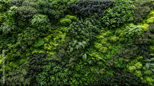 Textured green wall covered in diverse plant life vertical garden