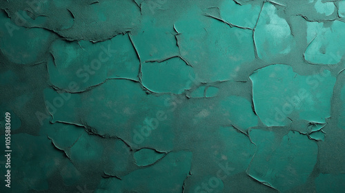 Textured green wall with peeling paint, featuring rough abstract patterns and cracks creating a unique rustic effect.