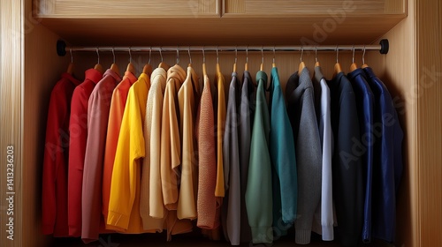 clothes rack, wooden, open, jacket, clothing, display, organised, neat, tidy, colours, colourful, arrangement, fashion, storage, rustic, modern, blend, texture, grain, fabric, woven, cotton, wool, linen, shelf, hanger, minimal, design, aesthetic, clean, collection, visible, accessible, practical, stylish, home, interior, decor, lifestyle, simplicity, order, harmony