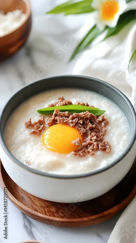 thai, rice, porridge, minced, pork meat, egg, comforting, protein, rich, asian, breakfast, support, guts, health, hydratation, health food, low carb, balanced diet, alimentary