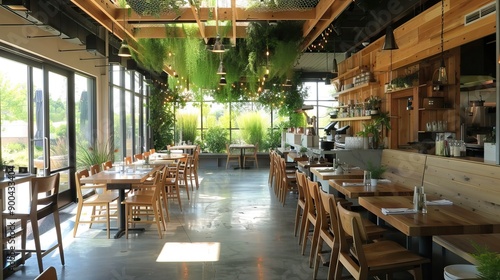 Thai restaurant with nature forest trees. Interior design. AI generated illustration