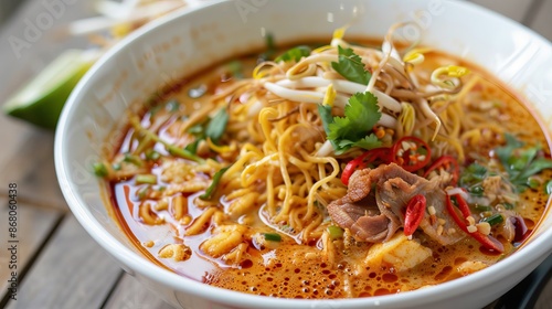 Thai spicy noodle soup with chicken, chili, lime, and fresh herbs in a white ceramic bowl on a wooden table