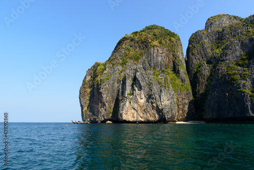 asia, attraction, background, bay, beach, beautiful, boat, clear, crystal, green, holiday, head, island, landscape, limestone, mountain, maja, moored, national park, natural, nature, paradise, park, sea, seascape, blue skies, sunny day, summer, thai, siam, tour tourism, holiday maker, traditional, travel, tropical, transport, vacation, visit, view, water