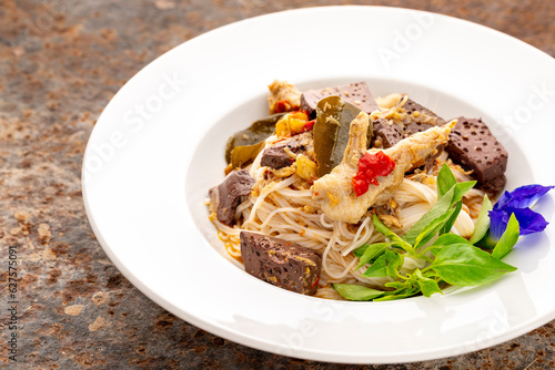 Thai vermicelli, Thai rice noodles with chicken feet, chicken blood curd in coconut milk and red curry soup, top table view, flat lay, Kanom Jeen Nam Ya Krati, Khanom Jeen Nam Ya Kati