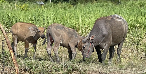 agriculture, animal, baby animal, calf, countryside, domestic, environmentally friendly, ecology, family, farm, farmhouse, grass, grazing, greenfield, greenery, herd, farm animal, mammal, meadow, natural, nature, pasture, peaceful, southeast asia, summer, sunlight, sustainable, siam, tropical, water buffalo