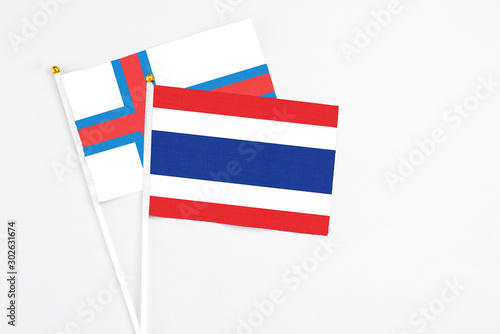 Thailand and Faroe Islands stick flags on white background. High quality fabric, miniature national flag. Peaceful global concept.White floor for copy space.