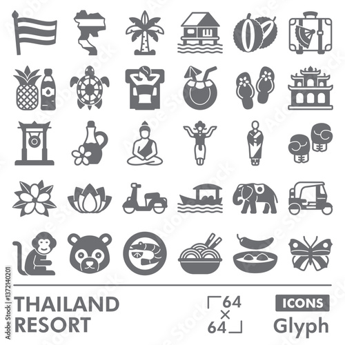 Thailand resort symbols collection or sketches. travel theme icons in glyph style signs for web and app. Vector graphics isolated on white background.