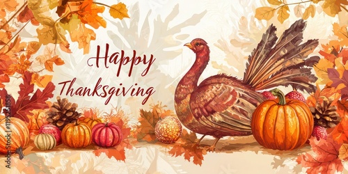 Thanksgiving banner with festive autumn elements and "Happy Thanksgiving" in elegant script
