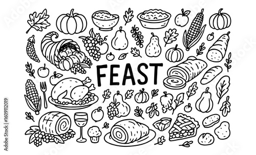 Thanksgiving feast doodle: harvest and celebration in black and white
