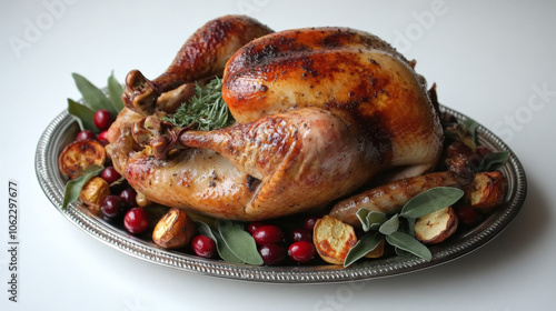 Thanksgiving Roasted Turkey on a Silver Platter with Cranberries and Sage