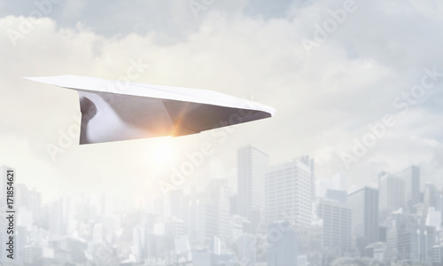 paper, plane, fly, air, aircraft, city, city landscape, aeroplane, aviation, blue, bright, business, cloud, natural, concept, flight, freedom, high, jet, play, sky, white, wing, away, joy, light, object, simplicity