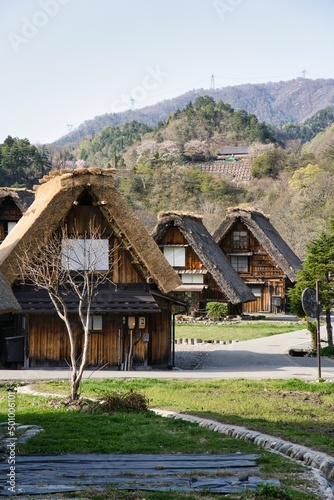 Thatched roof or gassho-zukuri house and cherry blossoms in full bloom.