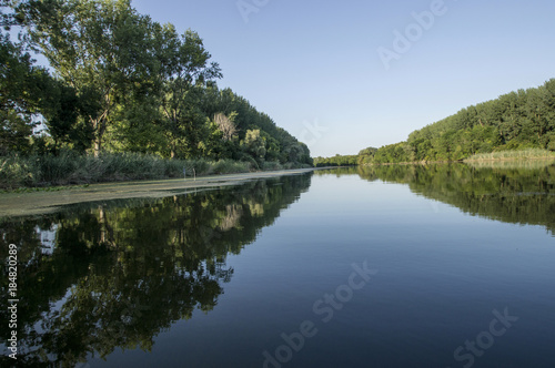 The surface of the river acts as a mirror. The shores of the river are covered with lush vegetation. Trees and reeds are reflected on the surface of the river. On the horizon is the end of the trip.