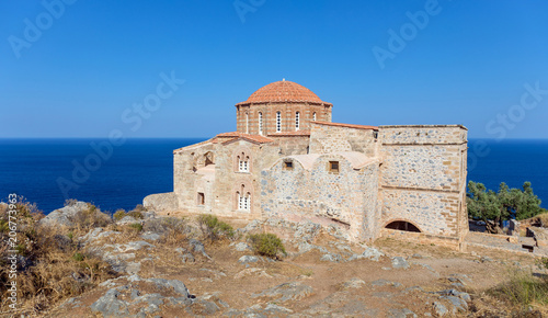 The 12th century Byzantine church of Agia Sofia stands on the highest point of Monemvasia, Peloponnese, Greece.