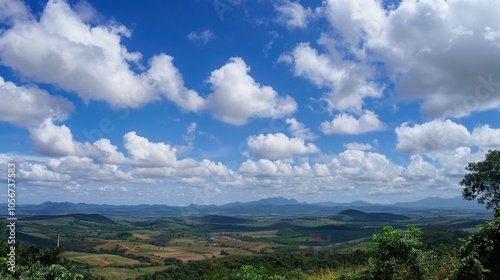 The allure of a landscape filled with the beauty of blue sky, fluffy white clouds, majestic high mountains, and vibrant green plants. Generative AI