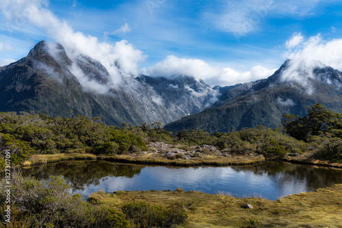 The alpine tarn at the top of The Key Summit, part of the Routeburn Track in New Zealand's Fiordland National Park