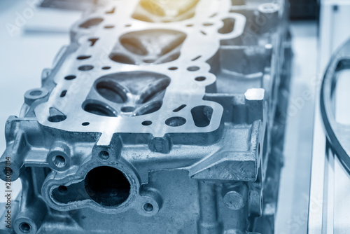 The aluminium cylinder head of the engine in the light blue scene. The automotive parts manufacturing process.
