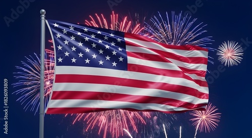 The american flag waves proudly against a spectacular display of colorful fireworks, embodying patriotism, freedom, and national celebration