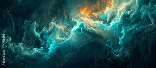 The artwork depicts a stunning portrayal of the atmosphere with clouds in varying shades of electric blue against the vast aqua sky, evoking a sense of space and astronomical wonder.