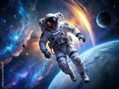 The astronaut navigates the infinite expanse of deep space surrounded by vibrant cosmic colors and distant planets while floating gracefully