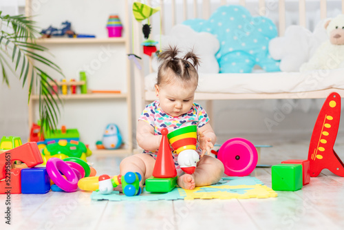 the baby is playing at home in the nursery. Toys for small children. A child with educational toys. Early development