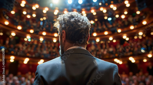 The back of an actor on stage in front of the audience, wearing formal attire and facing forward