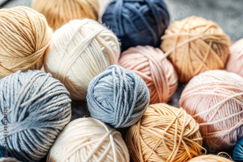 The background is made of balls of wool yarn . Needlework, textiles, knitting. Winter season, small business, handmade clothes.