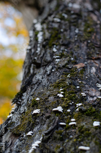 The bark of the tree and the white mycelium or moss covering the bark. Natural background and texture.
