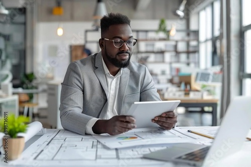 The beautiful African American male architect is looking at a digital tablet over a blueprint on his desk.