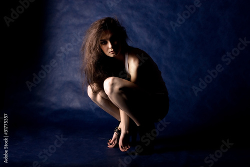 woman, model, caucasian, mystic, glamour, 1, black, female, style, human, attractive, only, studio, fashion, dark, portrait, woman, young, femininity, sensuality, beautiful, slim, temptation, chest, on, adult, symbol, finger, open, actress, people, posing, figure, girl, face, colours, hair, make-up, elegance, blue, dark blue, background, curly, expression, person, beauty, secrecy, looking