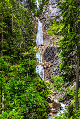 The beautiful three-part Lower Martuljek Waterfall in the Julian Alps, Slovenia. Triglav National Park. Scenic mountain with Martuljek waterfall in Triglav national park in Julian Alps, Slovenia.