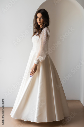 The beautiful woman posing in a wedding dress