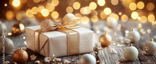 gift, present, decoration, holiday, celebration, bokeh, festive, christmas, ribbon, box, wooden, shiny, ornament, gold, silver, glistering, light, cosy, warmth, winter, new year, joy, surprise, party, seasonal, background, beauty, traditional, cheerful, elegant, bright, style