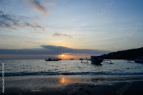 The beauty of Senggigi Beach at sunset with boats that decorate the beautiful beachfront
